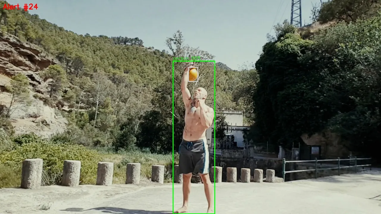 - Cooldown timer (15 frames): prevents triggering on the same motion event repeatedly. Without this, a person walking through frame triggers 50+ alerts.
